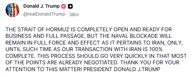 Meanwhile, Donald J. Trump said that Iran had announced the strait is fully open and ready for full passage, adding that while it is “completely open and ready for business,” a U.S. naval blockade would remain in full force as it pertains to Iran until ongoing transactions between the two sides are fully completed.